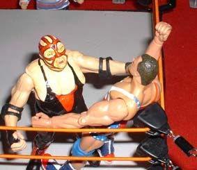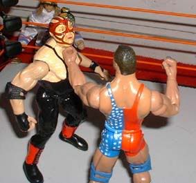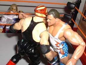 Vader whips Angel into the ropes, but he comes back with a powerful clothesline.
