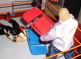 Christian gets some chairs and starts to pummel Vader.