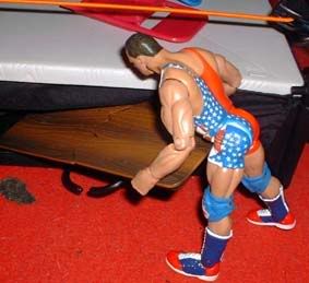 Angle goes outside and gets table, which he sets up in the ring.