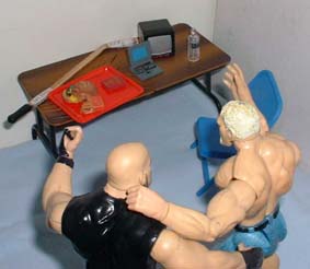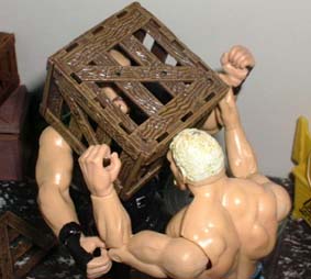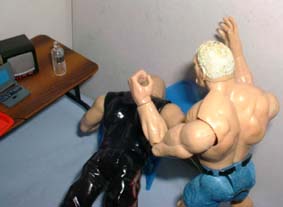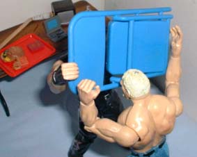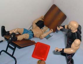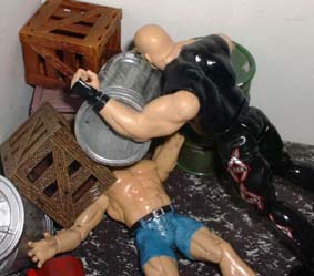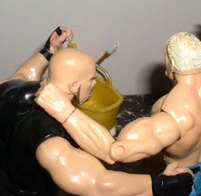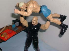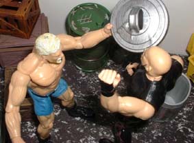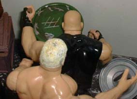 Steiners not letting up now, he breaks that create over Alberts big bald head.