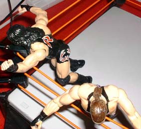 Rhyno charges RVD in the corner, but Van Dam moves.