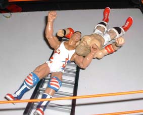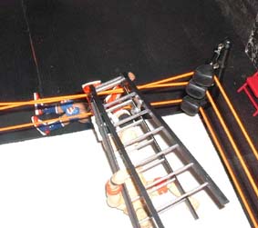 Christians got his hands on the belt, but Kurt throws all his weight into the ladder.