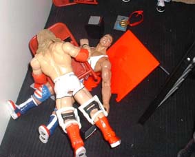 Christian can't get the belt and falls into the ropes, I think his foots stuck.