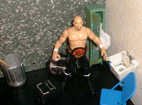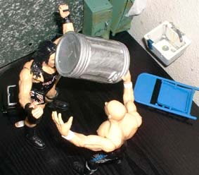 He dents that trash can over Rhynos head, and then drags him out of the locker room.
