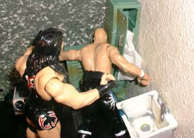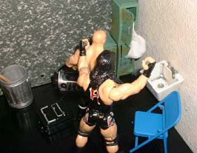 He uses a russian legsweep, and slams Rhynos head back into that sink.