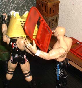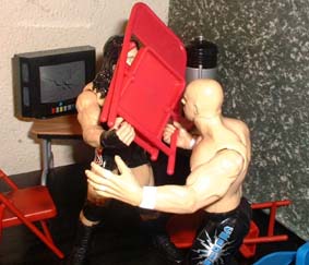 But Rhyno uses a DDT to drive Credibles Skull into another chair.