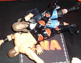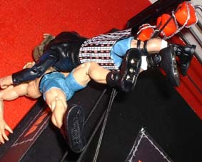Raven clothes lines Steiner over the top rope.