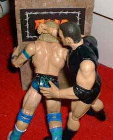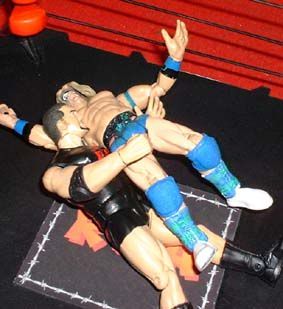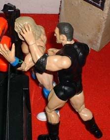 and then throws him out of the ring and then into the entrance