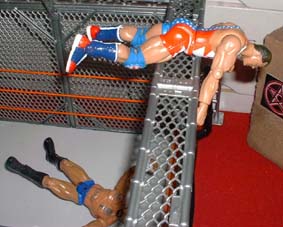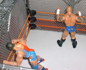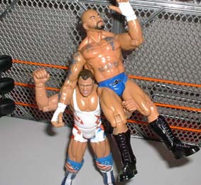 Saturn swings at Kurt again, but Kurt ducks under and hoists Saturn into an Angle Slam.