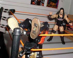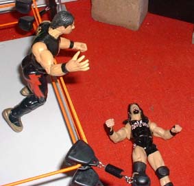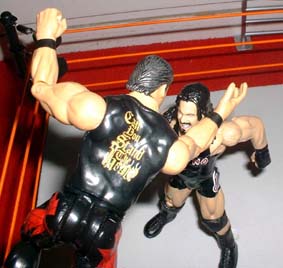 Eddie dumps Rhyno out of the ring.