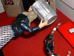 Raven slams Tazz in the head with the trash can.