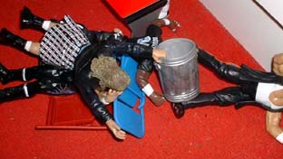 and smashes into everyone, sending them flying.
