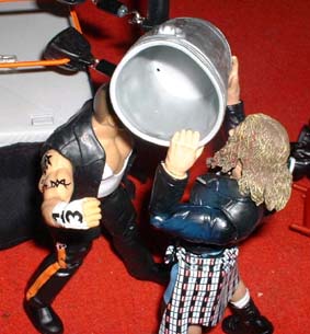 Raven keeps beating Tazz, cracking that hockey stick over his back.