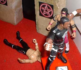 But Tazz leaps off the apron, throwing a chair at Credible.
