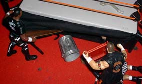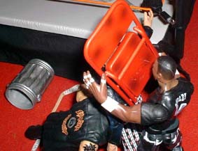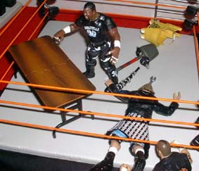 Devon sets up the tables, and Tazz rolls Raven into the ring.