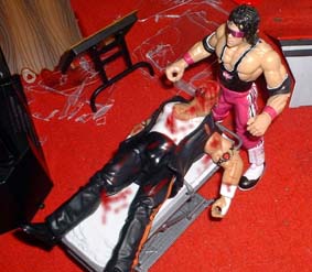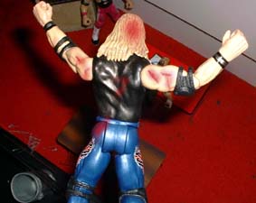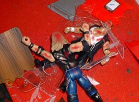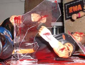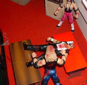 Christian then takes him outside, sets up a table, then puts Tazz on a pain of glass between the two