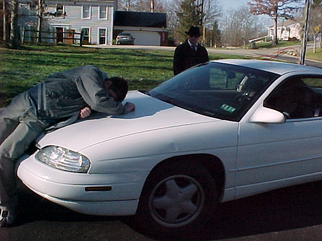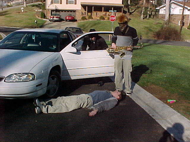 Saxy gets out of his car to survey the damage. Unfortunately he forgot he was blind and wasted a good hour trying to find what he hit.
