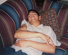 Matt Pumroy, a 99-00 Bass Drummer, gets comfy.
