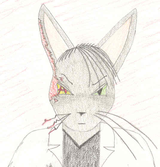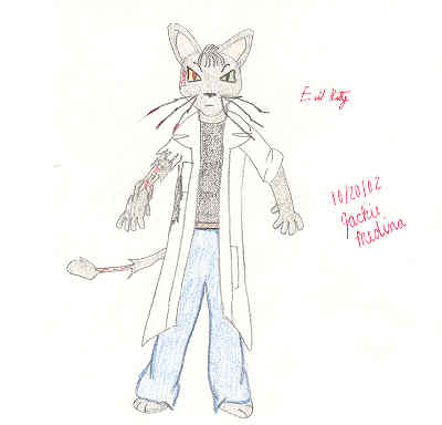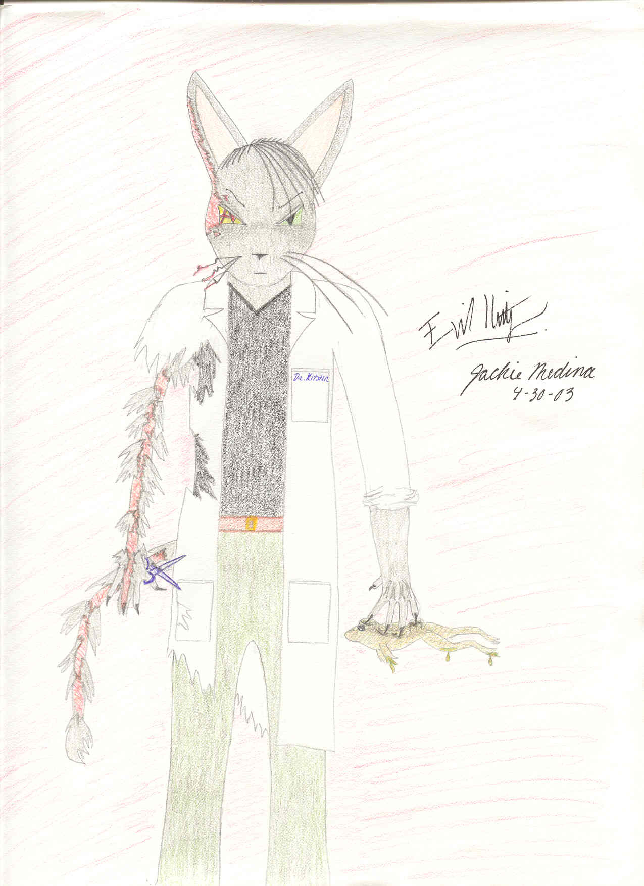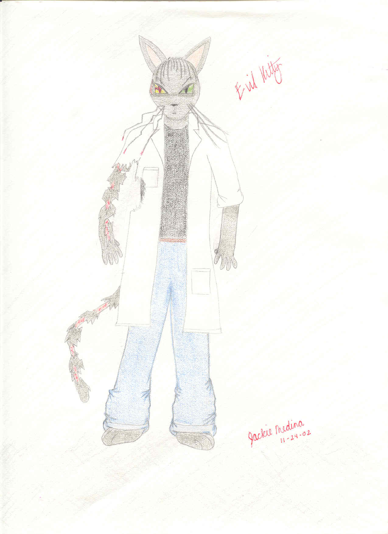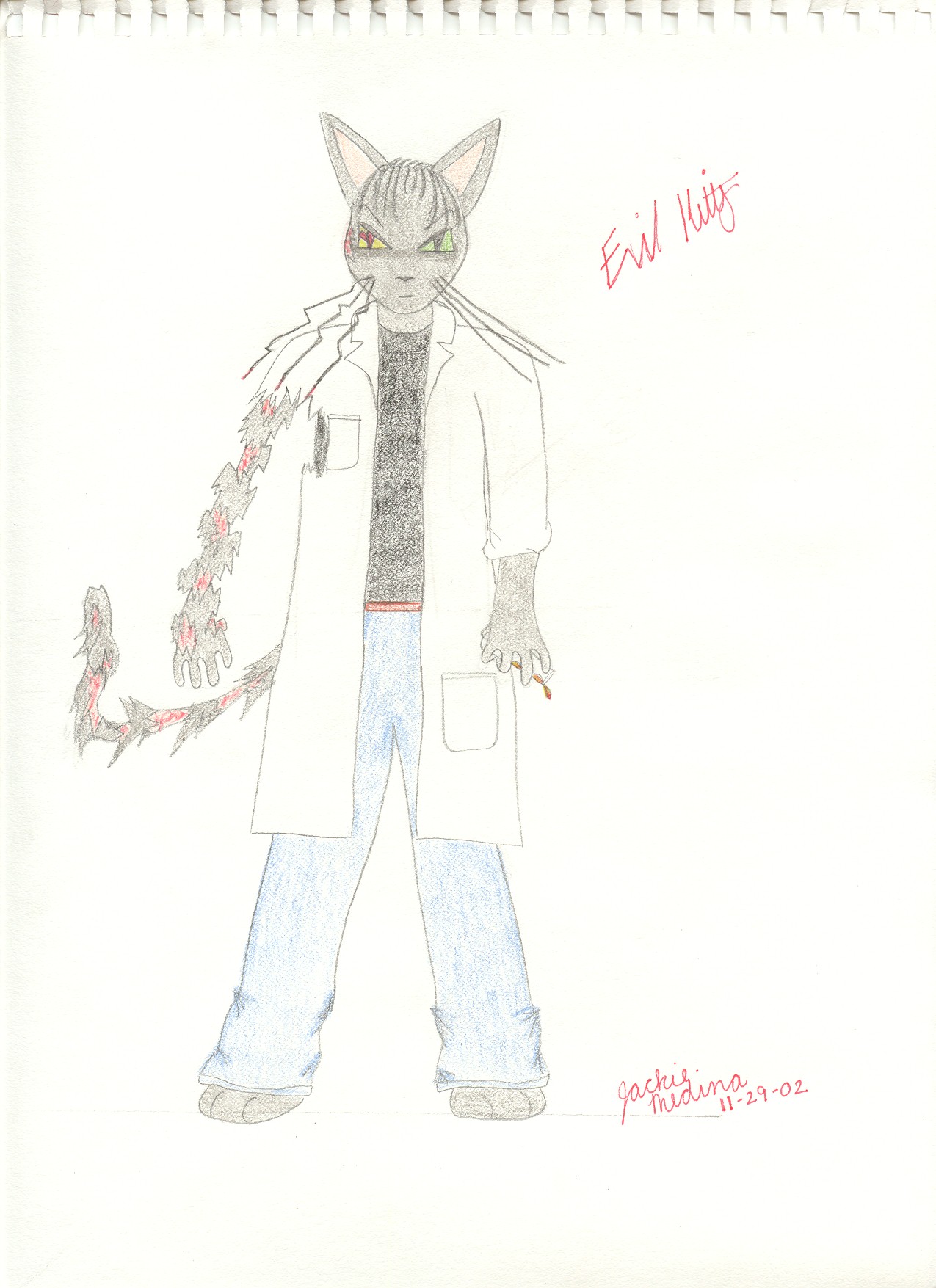 4/30/03 Evil Kitty - You will notice he's even more charred and mutilated, his hair style has changed, and he got himself a new pair of pants. Greenish-gray pants suit him much better. And notice the lab coat... It's more ripped and even has his name on it, just like a pro. doctor. Oh, and the dead frog... Don't miss that dead frog. ;)