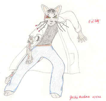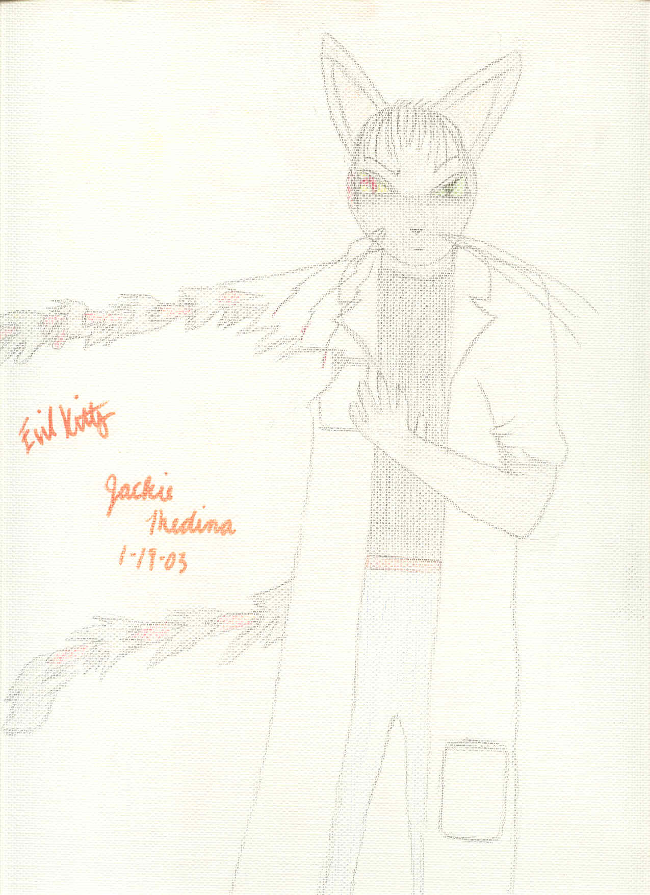 1/19/03 Evil Kitty - It's drawn on that paper made for acrylic painting, which explains the dotty texture of the pic... It looks really good on my wall, trust me... And the scan you see isn't the full pic because, well, it's too big to scan... But trust me; it looks good on my wall.