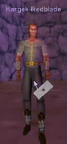 Kargek Redblade looks up from his forge and says, 'Hello there, can I help you?' Your eyes are drawn to an extremely large red sword scabbard strapped to his back with no sword in it. Kargek speaks again, 'I said, can I help you or do you need help from Wenden?'