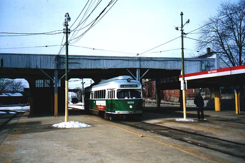 3238 sits in Mattapan circa January 2001. Even though only two cars are required for Sunday service, neither of the rebuilt cars were used on this day