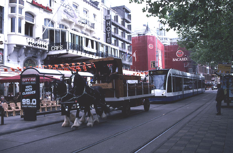 A little bit of old Holland. A tram waits at Rembrandtplein for a Heineken beer wagon to clear. Also of note, the cafes are decked out in Orange for the Euro 2004 match against Portugal. |