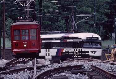 PCC 19 rounds the loop at Franklin. 5223 is on duty for the trackwork extension to Grove St. 19 has become MUNI 1078 painted in San Diego pea green. Click Here to see a shot of the car in San Fran on nycsubway.org |
