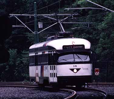 14 rounds the bend approaching Orange St inbound. This car is now MUNI 1070 and carries the former Public Service of New Jersey blue / grey livery. Click Here to see a shot of the car in San Fran on nycsubway.org |