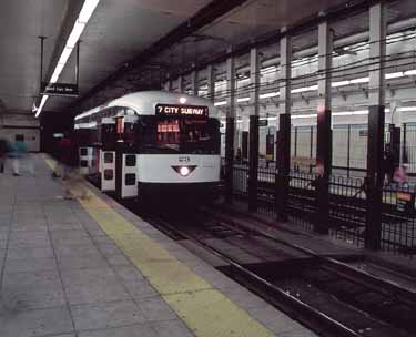Car 9 stops at Warren St. This car has become MUNI 1080 and wears the "Fruit Salad" livery of the LAMTA. Click Here to see a shot of the car in San Fran on nycsubway.org |