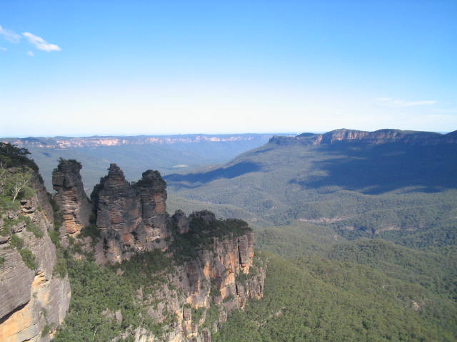 Random thoughts, march 6th, 2005. Took a train up to Katoomba today, don't know why I did that. I'm not usually the impulsive type. Arf! Okay, I'm no Joel, and I didn't meet a Clementine, but it did kinda feel like that, getting out of the big city for the afternoon. And how cool are those double-decker trains with the moving seats so you can pick which way you face? The Lonely Planet guide advises all travellers to be aware of a noticeable temperature drop when they go out to the Blue Mountains: BULLSHIT! Fucking hottest day so far since I arrived in NSW, I was sweating like Jacko in a nursery all day. Anyway, as usual when I go on a daytrip, I ignored all the tourist information and sightseeing possibilities and instead fetched up in the first decent pub I saw, the Carrington hotel. It was hot, the place was empty and they had footy on tv, all good reasons to stop off for a few beers and work up to some sightseeing. I eventually managed to drag myself down the hill to Echo Point, which is the main lookout point for the mountains and, in particular, the three sisters. No connection to the edinburgh pub, just three bits of rock sticking up in the air. All pretty spectacular though, took plenty of pix, then spent a pleasant hour wandering around one of the walking tracks around the mountains. Didn't have any idea where it was taking me, but that kinda made it more fun y'know? Finally found my way back into town, where I had particularly fine burger in a greasy-joe cafe whose name escapes me; full marks for the guy noticing my accent and immediately giving me vinegar for my chips too! After that there was just time to sample a few more cold ones at the Gearin before catching one of those superb trains home. a darn pleasant afternoon, and all for a mere $14 too! Shame it wasn't more like Montauk though...