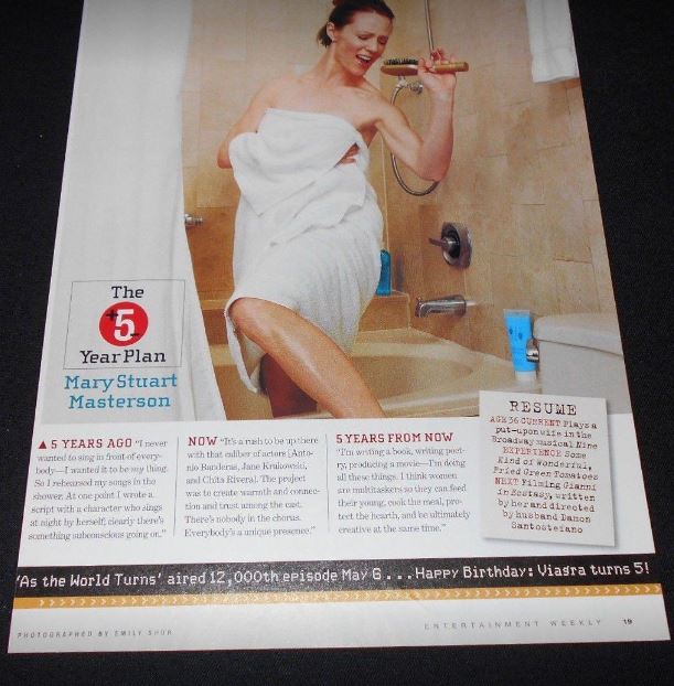 The most interesting to me was the article and photo of Ms. Masterson from Entertainment Weekly from sometime in 2002 or 2003, shown above. It was from an article titled Mary Stuart Masterson's Five Year Plan and highlighted her upcoming role in the Broadway musical Nine. MSM discussed with the reporter about how she liked to sing in the shower, and the photo showed her wrapped in a towel and stepping out of the shower. I posted that I recalled that article, but somehow didn't save a copy. I still can't remember if I sent it to Yun Leong along in Australia along with another magazine. Anyway, the copy of the article was on sale on EBAY. There is no other copy of either the magazine or the article alone anywhere on the Internet.
