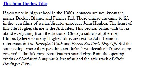 Years ago, the Tavern linked to a site called The John Hughes Files, which was mentioned in the post on the FYI Page about the death of John Hughes, the director of MSM's extremely popular movie Some Kind of Wonderful. Christine Giseske created that site in 1996, the earliest year when average Americans began putting up personal Web sites on the Internet. Ms. Giseske was in college at the time, suffered from a bout of the flu, and while absent from classes for a few days, rented and watched several Hughes movies. This inspired her to create the site which became the most prolific provider of the history of John Hughes as a filmmaker, along with the most recent developments in his career. It became a huge database of news and trivia about John Hughes and his films. Some Kind of Wonderful was frequently mentioned on the many pages, along with the performers, including Ms. Masterson. I recently became curious about the status of The John Hughes Files, and clicked on the link, only to discover the link was dead. Some years before, about 2011, Christine had informed her visitors to The John Hughes Files that the site would no longer be updated regularly. A visitor, Scott Collins, had volunteered to continue to upload recent articles, but updates would be very irregular from that point on as her life priorities had necessarily changed. Now, the site was gone. When I tried her River Blue site, for which The John Hughes Files was a satellite site, I discovered that Christine Giseske had passed away. Her site is no longer active, but is still available on The Wayback Machine. I took some screen captures from The Wayback Machine to show new visitors to the Tavern how the site looked.
