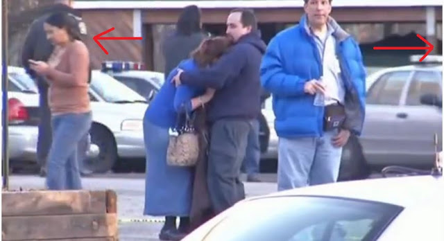 A copy of a still from network news coverage of activity at the Sandy Hook Firehouse near Sandy Hook Elementary School in Connecticut on December 14, 2012. Take note of the large garage style shed in the background, behind the people and the parked cars. The location of the shed on this property will be documented in aerial and ground photographs that follow. Note also some of the dark blue highlights on the edges of some of the people and on the pole that is in front of the woman in the jeans and tan sweater looking at her cell phone. This is evidence of "bluescreen bleed," when pixels are affected by poor bluescreen insertion.