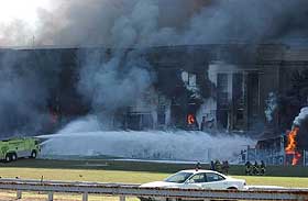 The first satellite image shows the section of the building that was hit by the Boeing. In the image, the second ring of the building is also visible. It is clear that the aircraft only hit the first ring. The four interior rings remain intact. They were only fire-damaged after the initial explosion. How can a Boeing 757-200 - weighing nearly 100 tons and traveling at a minimum speed of 250 miles an hour - only have damaged the outside of the Pentagon? The next two photographs show the building just after the attack. The aircraft apparently only hit the ground floor. The four upper floors collapsed toward 10:10 am. The building is 78 feet high. How can a plane 44.7 feet high, over 155 feet long, with a wingspan of almost 125 feet and a cockpit almost 12 feet high, crash into just the ground floor of this building? Look at the photograph of the lawn in front of the damaged building. Where is the debris? Any debris! Did it all disintegrate on contact? There are photographs, which show representations of a Boeing 757-200 superimposed on the section of the building that was hit. What happened to the wings of the aircraft? Why isn't there any wing damage? It's time to reshuffle everything in your mind that you think you already know, in so doing you may see for the first time and awaken to a another world not your own.
