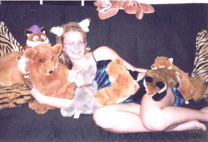 I recently went on a cross-country trip with a really good friend of mine, and he's a fur. Basically, a fur is a person who has an animal persona who they feel is an extension of their personality and their traits (really, the best explination you're gonna get is straight from a fur). His persona is a red fox and we stayed with another fur in Michigan who is also a fox. This pic is me wearing my friend's ears, chillin' in my PJ's on a futon with a bunch of plushies. I feel like I should be on the cover of a soft-core fur porn mag ;)
