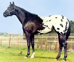 Draven's Dublin Raven f. 1988 First foal crop in 1992. Black, blaze; blanket with spots. OF Breyer "Skullduggery" SR 2001. Sire: Zeus' Treasure (Stud Spider [r] x Daze E.) Dam: Celtic Peacock [bso] (Prince Plaudit [r] x Rhiannon [bso]) Breeder: Mythic Stone Stables. Sire is real-horse-bred by ApHC Hall of Famer, Stud Spider, and out of a model Poco Lena daughter. Dam is real-horse-bred by ApHC Hall of Famer Prince Plaudit, and out of an imported [bso] Irish Draught daughter of Daly's Darling (real 1962 bay RID mare). Get include: Can't Rain All The Time (1995 black, with lacy blanket KNN/ApSH mare; not yet shown); Draven's Irish Stone (2000 black, extended blanket with spots colt; owned by Marta Towne). Has consistently placed top three in gender and color classes. MApSHA Foundation Sire. 1992-current.