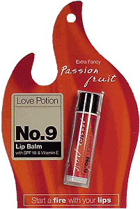 Blue Q 'Love Potion no.9 Lipbalm'...Start a fire with your lips using this extra fancy passion fruit lip balm from Blue Q. Superb non-petroleum formula keeps lips supple and loveable. Fortified with SPF 18, Vitamin E and Echinacea extract.