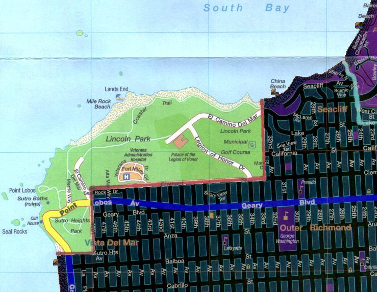A rugged seascape of rock, cliff and cypress woods, Land's End is the wildest part of San Francisco. It can be reached by foot along the Coastal Trail, which begins at some stairs in Lincoln Park. Every year, a number of hikers and tourists who foolishly leave the marked trail are lost when they are trapped by incoming tides or swept away by high waves.