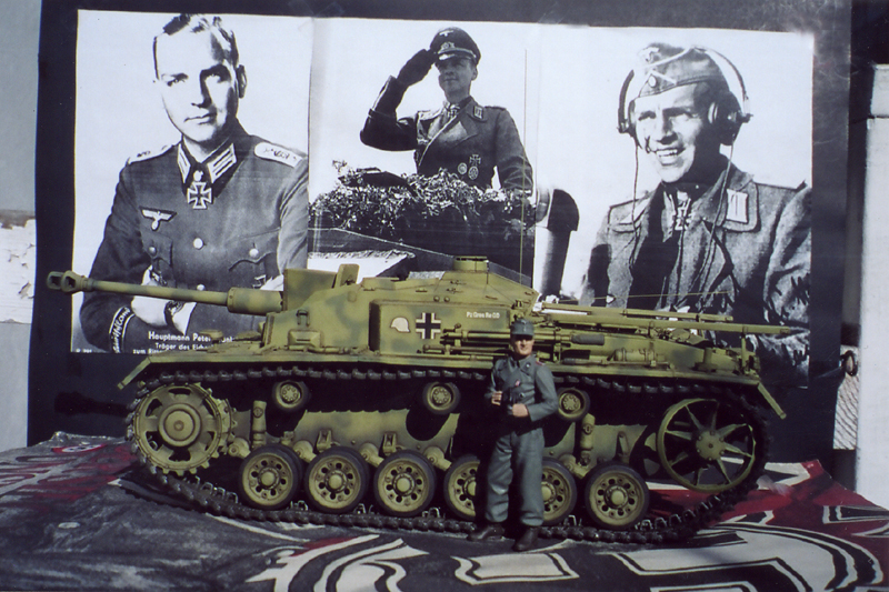 MAJOR PETER FRANTZ. The subject here is the German Sturmgeschutz and one of its men. The Sturmgeschutz was the Wehrmacht's tank busters. By cautious estimates they destroyed far in excess of 30,000 enemy tanks! They achieved more tank kills per gun than the tank arm. The Sturmgeschutz was a typical German weapon in layout, design and operational planning. This type of armored weapon was not to be found in the inventories of the British or the Americans. On the Eastern Front, the German Sturmgeschutz were so successful against the Russian tanks, that a standard order was hammered into the Russian tank crews that they should avoid duels with German Assault guns whenever possible. Afterwards, it was the Russians which were starting to deploy some assault guns in their inventory in the SU series after stealing the idea from the Germans. Not only were the Sturmgeschutz capable of matching the tanks--- their larger, technically much more complicated, more expensive and heavier contemporaries---in shooting precision; they were also their equals in speed, penetrative ability and offensive spirit. One shinning example in the German Sturmgeschutz assault gun was Major Peter Frantz, Commander of the 1st Battery Sturmgeschutz Abteilung "Grossdeutschland". On the Russian front, since the start of the invasion, he and his StuG had fought the Russians in battles like few recorded in the history of the Sturmgeschutz. He overran Soviet batteries, stormed across rivers, blasted anti-tank barricades, wiped-out enemy supply columns and blocked avenues of retreat. During an attack in Woronesh, Russia, in Operation Blau, the summer offensive of 1942, Peter Frantz with his StuG destroyed 14 enemy tanks by himself in one single engagement. On 13 June 1942, Peter Frantz received the Knight's Cross for his dauntless actions on the Russian front. On March 14 1943, in Stanowoje, Russia, he once found himself in a seemingly hopeless situation. Major Peter Frantz was faced with being overrun and eventual death or captivity. He wanted neither. So he stood his ground against 60 attacking Soviet tanks, virtually down to his last round of ammunition, he made every round count, he called in artillery fire directly on his position, when all seemed lost, he saw the attacking force slow to a halt and pulled back, the line had held. Thanks to his courage under fire and his gunner's accuracy, the battlefield remained in German hands. And all the destroyed and inoperable enemy tanks could be counted. There were forty-three T-34's left lying on the field, their remains bearing witness to the fierceness of this fight. For this unique defense operation by his battalion, for his masterly tactical leadership and for his personal bravery, which at this place had been decisive and prevented a disaster. Major Peter Frantz became the 228th soldier of the Wehrmacht to receive the Oak Leaves to his Knight's Cross of the Iron Cross on 14 April 1943. The award was rendered personally by Adolf Hitler in a ceremony conducted in the Reich Chancellery. Upon his return to his Battalion, he was the object of a famous day-long celebration highlighted by a parade and review in his honor by his Battalion. On January 17 1944, Major Peter Frantz was transferred to the Kriegsakademie for General Staff training. Peter Frantz always led his Battalion according to his motto: That only ruthless, offensive-minded tactics, with a large element of calculated risk-taking based on the strengths of the vehicles and the skills of their crews could guarantee the Sturmgeschutz superiority on the battlefields against massive Soviet tank forces.