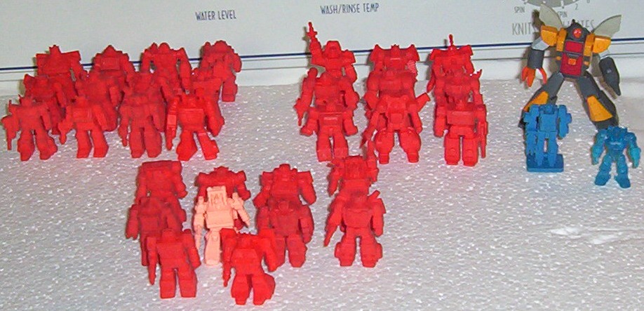 Devastator HOC PVC, yellow Japanese Mindwipe decoy and a black Ravage decoy of unknown origin, an orange Reflector decoy of unknown origin, and a red Shrapnel, that I use as a Kuwagatorer decoy.