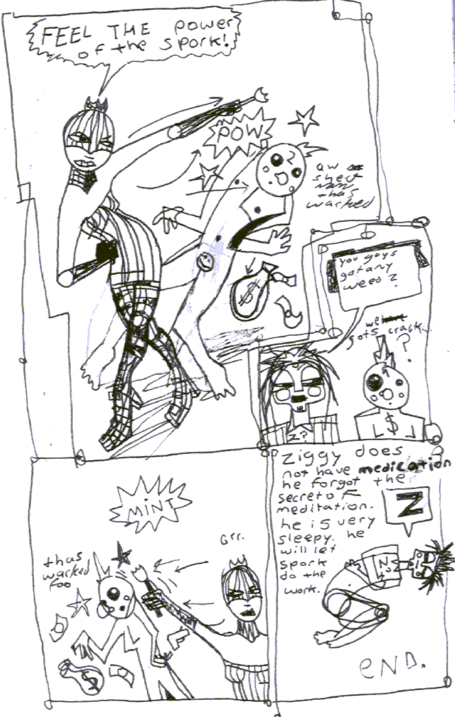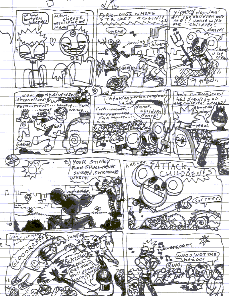episodes! alien invasion train adventure! fork mouse whore strikes again! crack-baby bank robbers page one! crack-baby bank robbers page two! spork girl vs. fork mouse whore (page one) spork girl vs. fork mouse whore (page two)