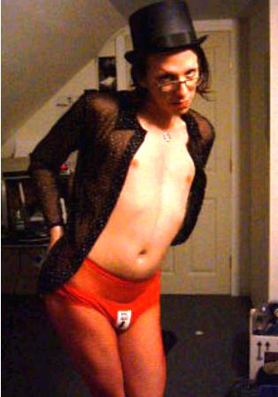 purchased at the costume shop, a nice black top hat, some white grease paint, some crazy glittery red sunglasses, some very nice red lipstick.