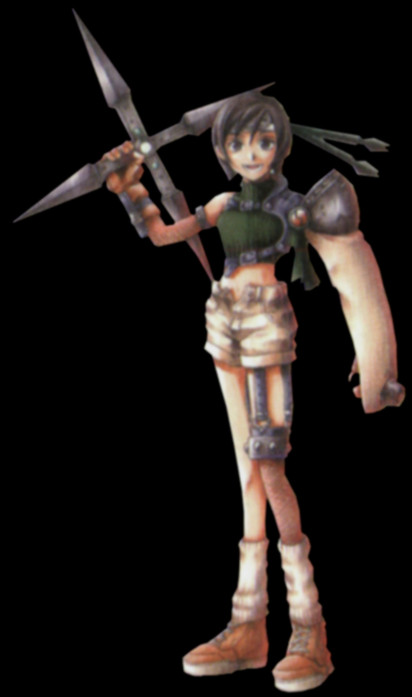 Yuffie Kisaragi Possibly the most irritating character invented in any story, Yuffie starts the game as a wasted mini-story and only goes downhill from there. She is discovered in the woods, and after an appropriate conversation with Cloud, she agrees to join the band. However, while in the woods she exhibits many powers and special abilities... not only does she "forget" all these upon joining the group, she also half-inches all their materia! Avalanche are forced to follow Yuffie to her home town, chase her round for a bit before finally getting all their materia back. Aside from that her entire contribution to the story line is feeling sick onboard the Highwind and not being selected for any battles unless it can possibly be avoided. Essentially as far as saving the planet is concerned, Yuffie is as much use as appointing Cait Sith the head of the European Bank. Her mini stories do provide an interesting detour, however, and help to increase Avalanche's strengths and abilities. |