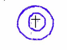 Finalmente, la propuesta de Weber es entender a la iglesia relacionada con el mundo de una manera dinámica (ver siguiente esquema). Así Cristo (1), quien está en el centro del mundo (A), convoca a sus seguidores a estar con él formando la asamblea de los creyentes –la iglesia (2). Cristo llama tanto para la adoración y el culto y la vida en comunidad, pero también llama para el testimonio y el servicio conjunto, enviándolos al mundo (B) para ser testigos en todos los ámbitos de la vida humana. ¡No queda rincón en el mundo dónde los cristianos no estén llamados a testimoniar!
