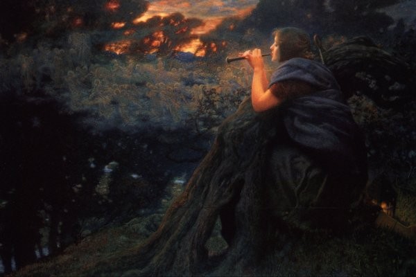 Hughes began his career among the Pre-Raphaelites, and like Edward Burne-Jones with whom he was acquainted, he inclined towards Symbolism. However, the majority of Hughes' work, carried out mainly in watercolour/gouache, displays the meticulous observation of nature and minute technique associated with the Pre-Raphaelite movement. He produced some very Pre-Raph portraits of girls with long hair also. However, it is the consistently symbolist nature of his work that separates him from the Pre-Raphaelites, and his best known work, "Night with her Train of Stars" is very much of that genre.