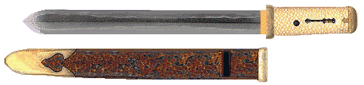 Ken are one of the rarer styles of tanto. Ken have double edged blades and were mainly made as Buddhist ritual implements although it is not uncommon to find them mounted and used as tanto. Some ken style tanto were made from cut down yari. Ken style tanto were made in Koto, Shinshinto and Gendai eras; but few were made during the Shinto period (few tanto of any style were made during the Shinto era). Ken blades may have parallel edges or double concave shapes as above. Some of the top sword smiths in history made ken as offerings to various temples. It is not uncommon to find ken with a vajra (double thunderbolt) style hilt in keeping with their use as Buddhist ritual implements.