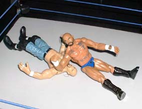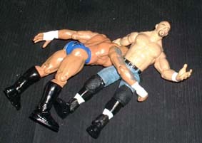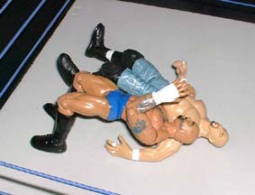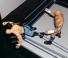 and hits a perfect suicide dive to the outside, knocking Saturn to the floor.