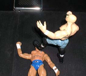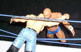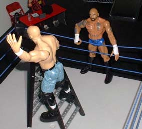 He then goes to the outside an grabs the ladder, but Credibles on his feet again.