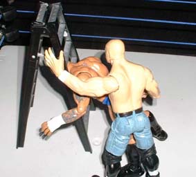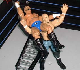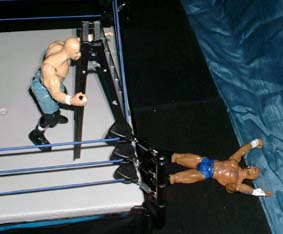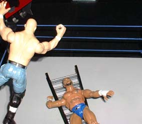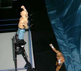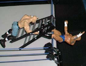 He pushes over the ladder, sending Saturn tumbling all the way to the arena floor.